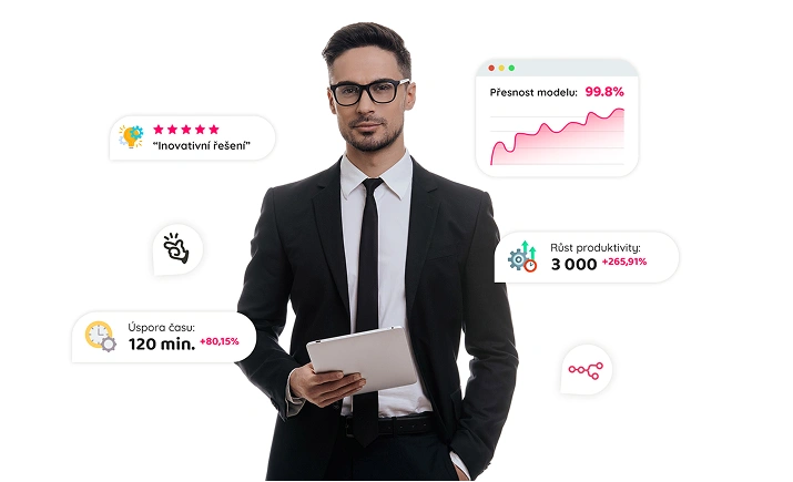 TECHNOLOGICKÝ NÁSKOK: Využitím AI ve vývoji a integraci získáte řešení, která se učí a zlepšují. Automatizované testování software, detekce chyb nebo úpravy kódu znamenají kratší čas nutný pro vývoj aplikací nebo software na míru včetně vývoje informačních systémů.
