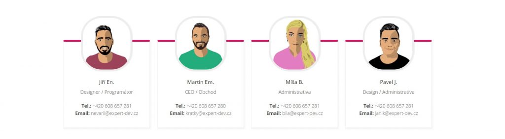 Jakákoliv firma by neexistovala, kdyby neměla kvalitní zaměstnance. Ukažte světu, kdo stojí za veškerou odvedenou prací. Můžete je představit pomocí fotografie, krátkého popisu a nebo také ve videu. Tímto nejen vyjádříte to, že se staráte o svoje zaměstnance, ale také i to, že si vážíte nejen jejich práce. Představením Vašeho pracovního týmu přiblížíte svoji práci ostatním a ukážete jim další část Vašeho podnikání. Když ukážete své zaměstnance, tak odhalíte další část své firemní kultury, protože bez zaměstnanců by většina podniků nefungovala. Dalším místem, kde také můžete ukázat své zaměstnance může být v bannerech či sliderech. Spokojený tým kterého práce baví hned osloví mnohem více potenciálních zákazníků.