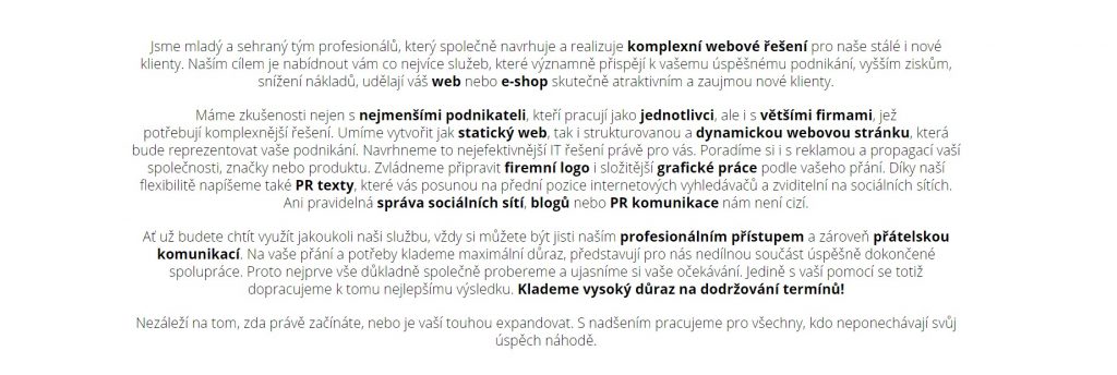 S tím se také pojí i textace, kterou budete mít na stránce. V některých případech, jako třeba u právníků nebo auditu, je na místě používat formální jazyk. Na druhou stranu pokud vlastníte třeba restauraci nebo malý obchůdek s dárkovými předměty, tak si můžete s textem více pohrát. Tohle vše však musí jít ruku v ruce s Vaší firemní kulturou, hodnotami nebo Vaši vizí.